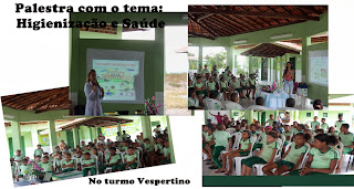 Na parte da tarde aconteceu à palestra com a Enfermeira Juliana e a Dentista Lorena, com os alunos de Pré-escola a 5º ano o com tema: Higienização e saúde falando onde os alunos foram orientados a escova os dentes corretamente e cuidar do corpo para ter uma boa saúde.